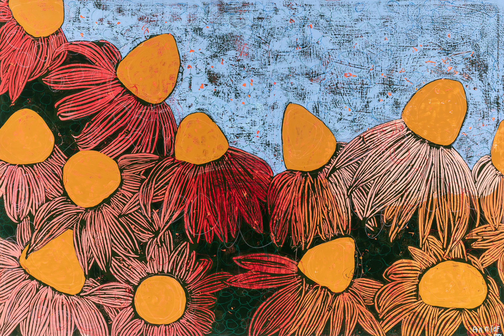 Two perspectives layered into one painting. It is a visual conversation between two artists—and sisters—and the local landscape. Each artist alternately contributed porous layers. This allowed their unique contributions to meld together into one piece.
